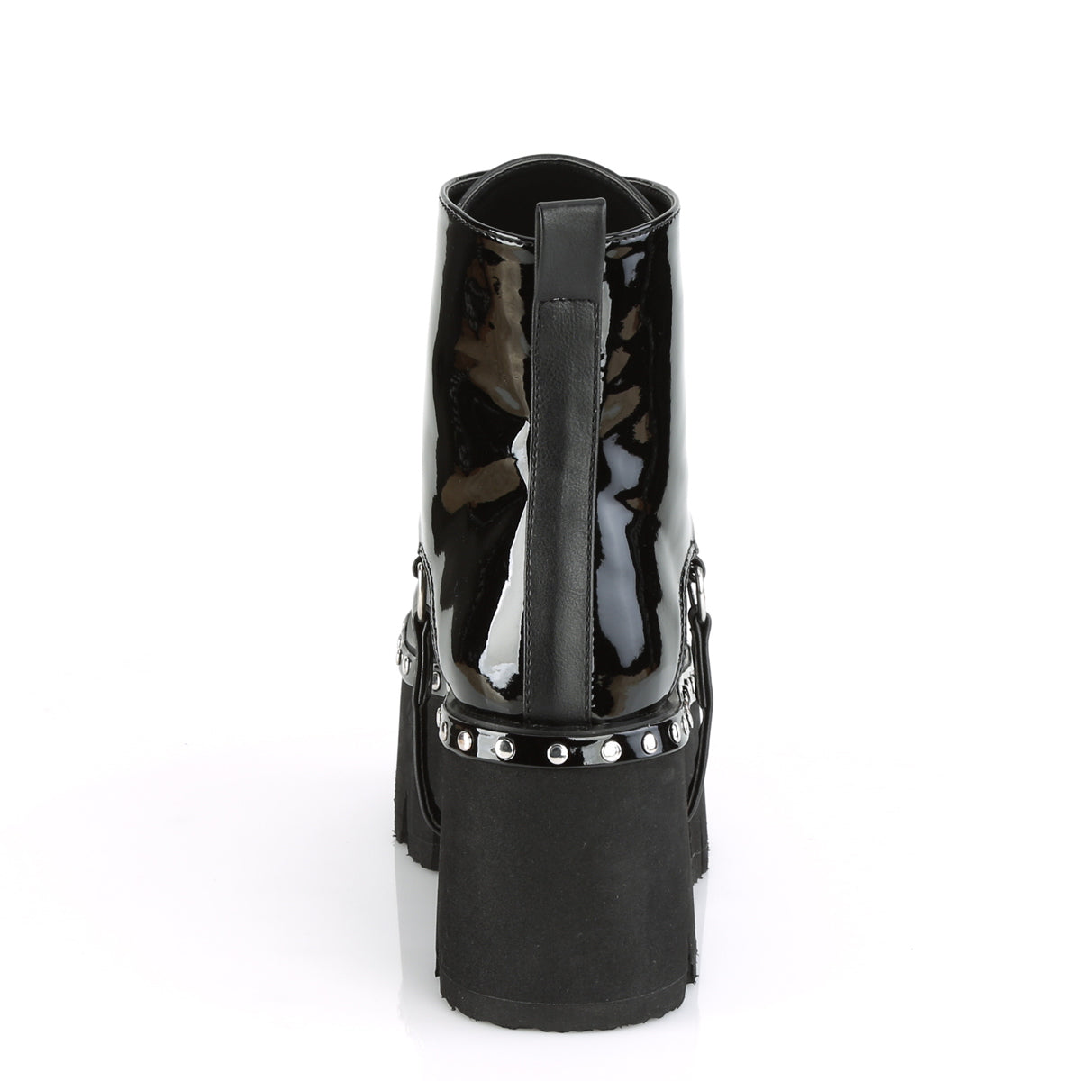 3 1/2" (90mm) Chunky Heel Cut Out Platform Ankle Boot w/ Metal Front Zip Closure, Silver Stud Embellishments on Upper & Trims Around the Platform Bottom & D-Rings w/ Harness Strap
