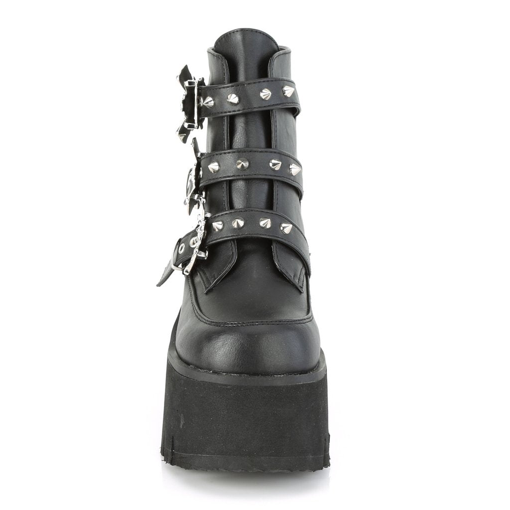 Chunky ankle boot featuring spiked out straps and bat buckles!