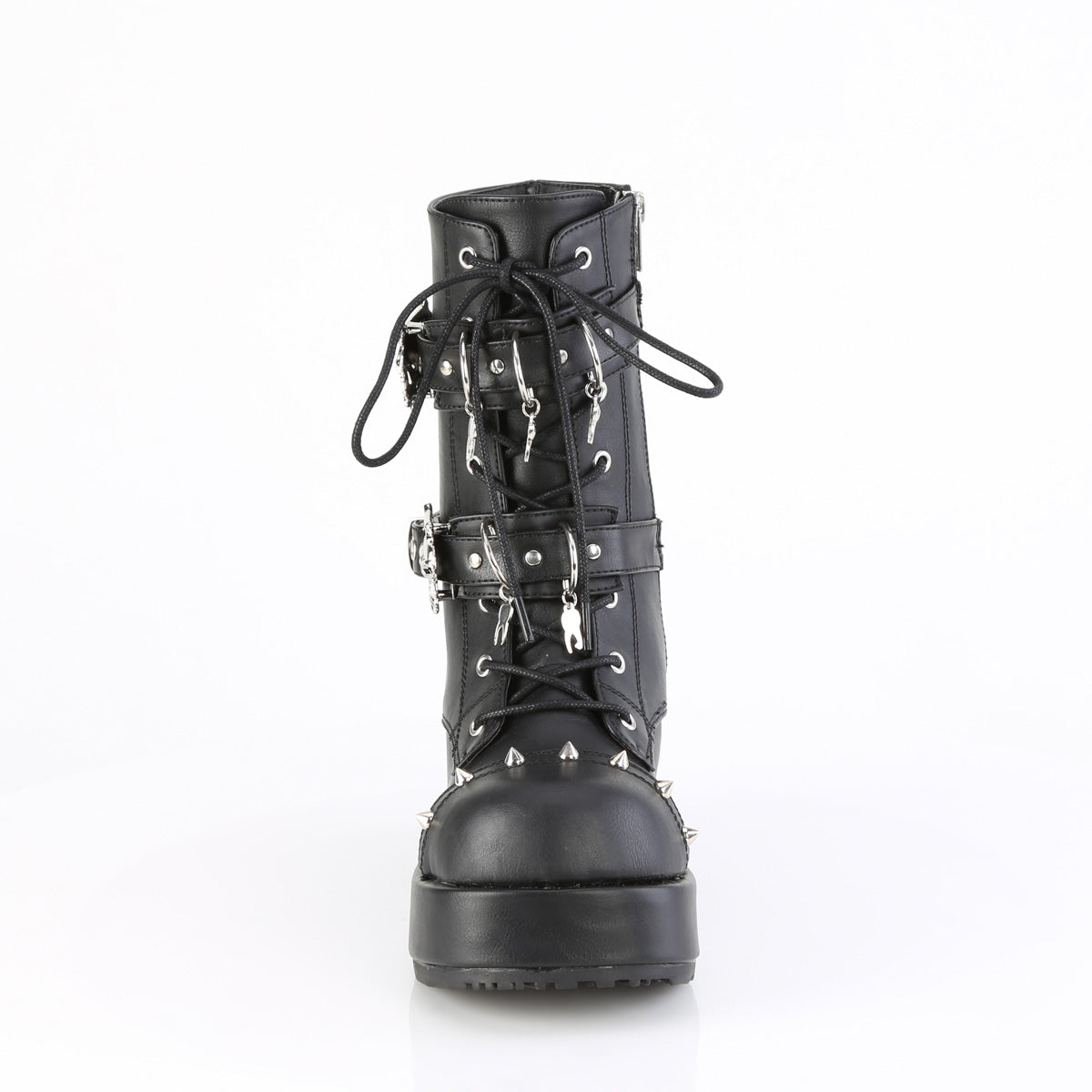 2 3/4" (70mm) Lace-Up Front Platform Ankle Boot Featuring Double Skull Buckle Straps, D-ring & Hanging Tooth Charm on Straps, & Cone Spike Studs at the Top Cap