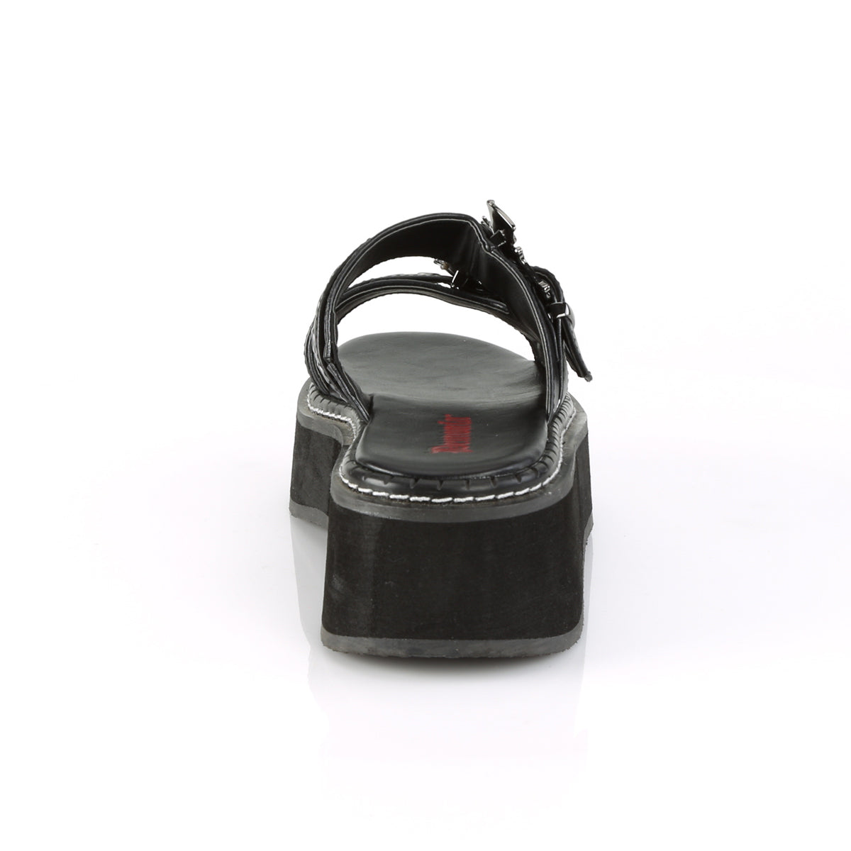 2" Platform Double Strap Slide Sandal Featuring Riveted Straps and Ornamental Bat Buckles