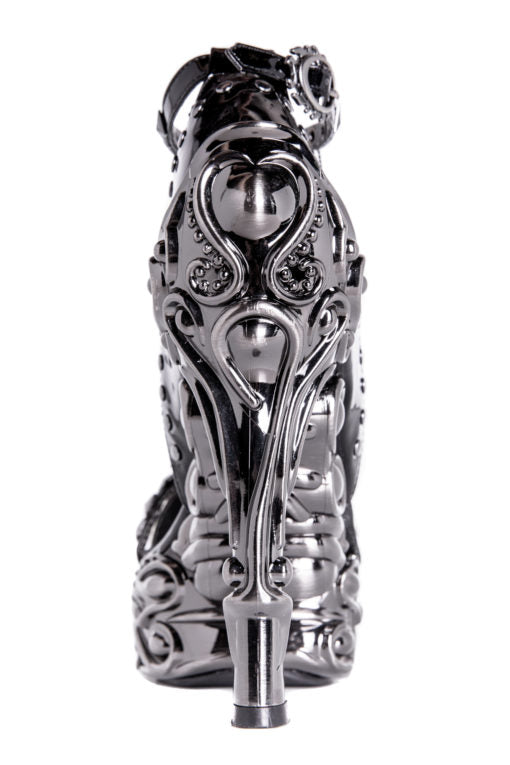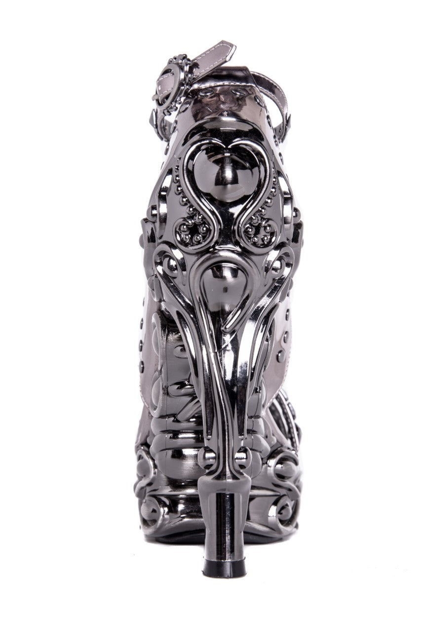 Steel colored micro-thin metal toe cap with inner padding for comfort, gunmetal pyramid studs on front & ankle to match heel and platform, black coloured vegan leather patent upper, decorative chains connected to adjustable ankle strap.