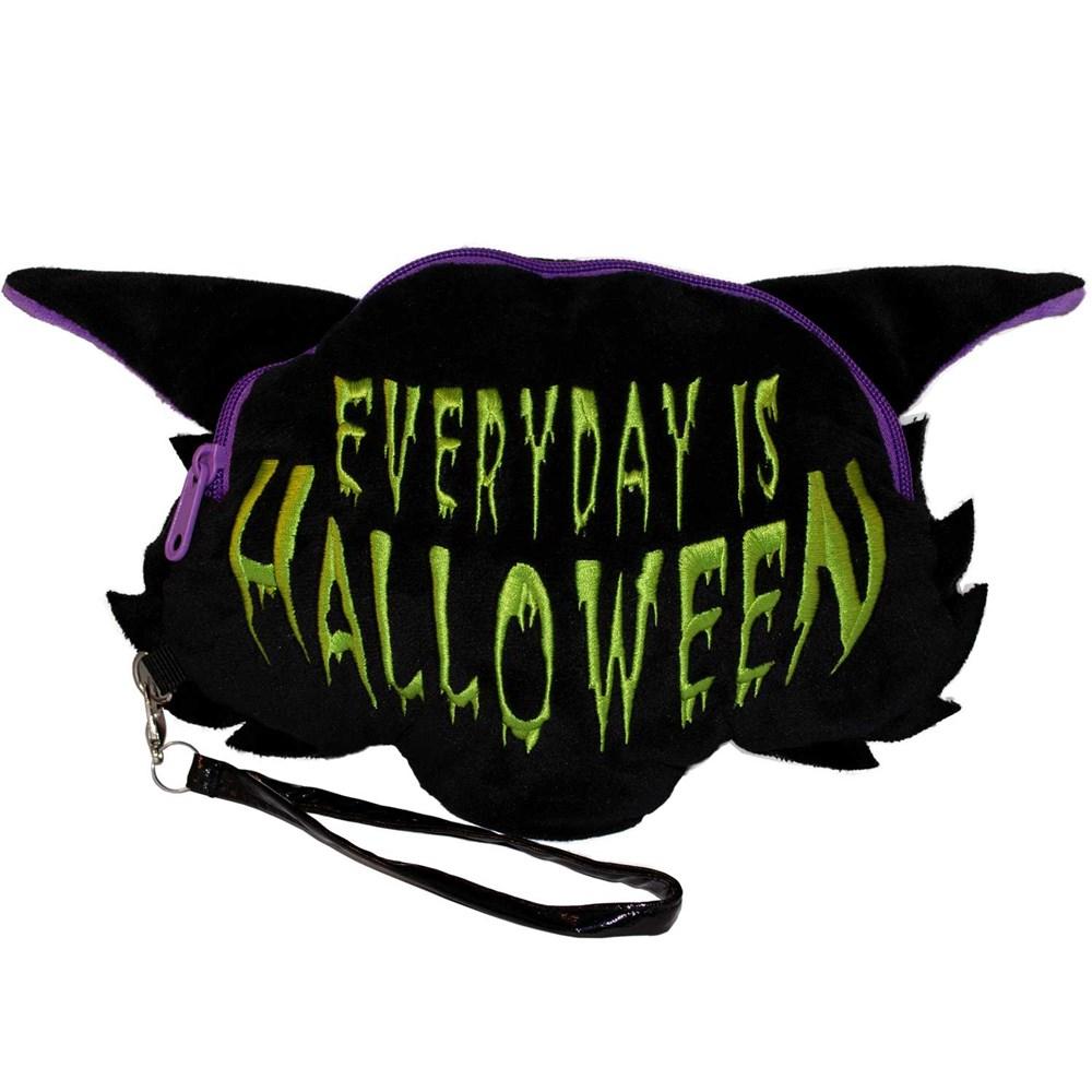 This wristlet is the PURRRR-fect mix of spooky and cute! Kreepsville 666 Kattitude Wristlet with a plush vintage halloween cat head with embroidered face on the front and "Every Day is Halloween" embroidered on the back, and a spooky green and black lining.