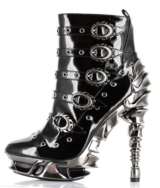 Chrome plated multi-piece spinal heel. 5 adjustable custom flame buckles adorned w/ silver eyelets.
