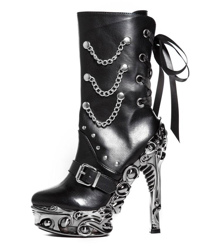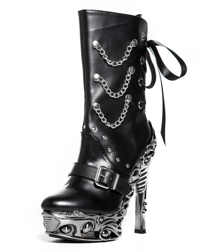 Rock rebel ankle high black vegan boots. Metal chains, machine pressed rivets and front buckle. Eyelet detail in back with adjustable satin laces. Constructed on our exclusive 6 inch Proteus gunmetal heel with 1.5 inch platform.