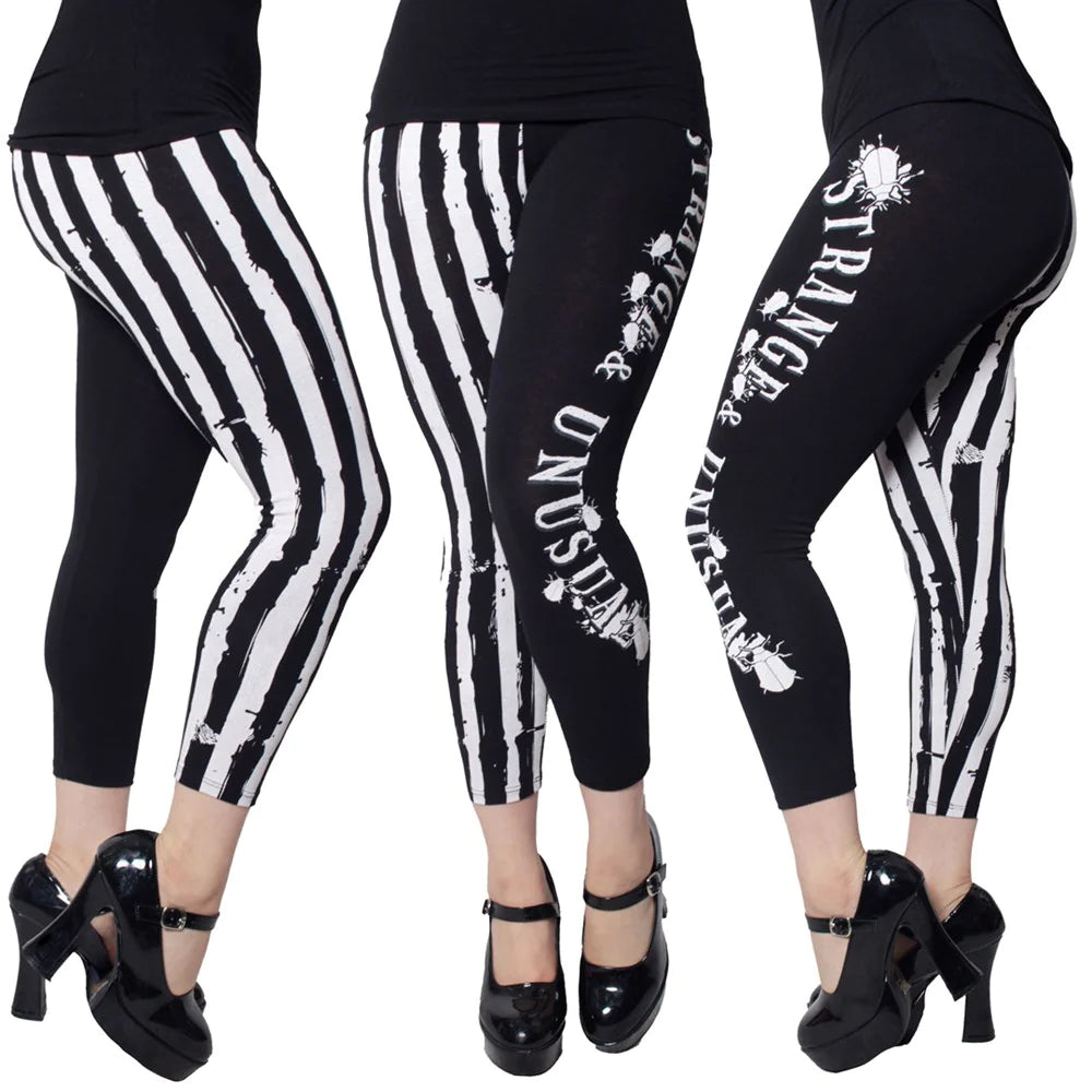 Be the ghost with the most babe with this Kreepsville Strange And Unusual stripe capri leggings! These capri-style leggings are the perfect mix of spooky and chic, it will show off your curves in all the right ways. With a bone white stripe down one leg and Strange and Unusual text on the other, these leggings are sure to turn heads no matter where you go. Made out of super soft 95% cotton and 5% spandex, its elastic waistband makes these leggings comfortable enough to wear all day long! Made in the USA.