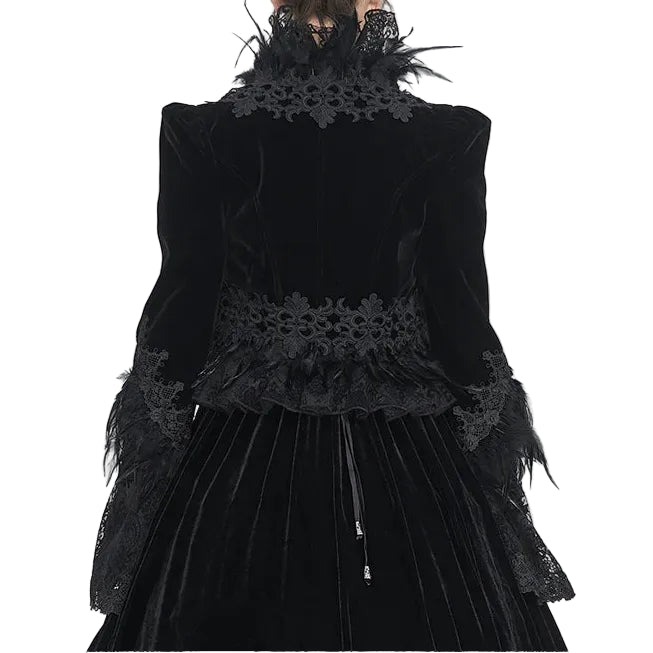 The main fabric of this gorgeous gothic jacket is made of velveteen fabric, with water-soluble lace and feathers. The front chest chain can be opened.